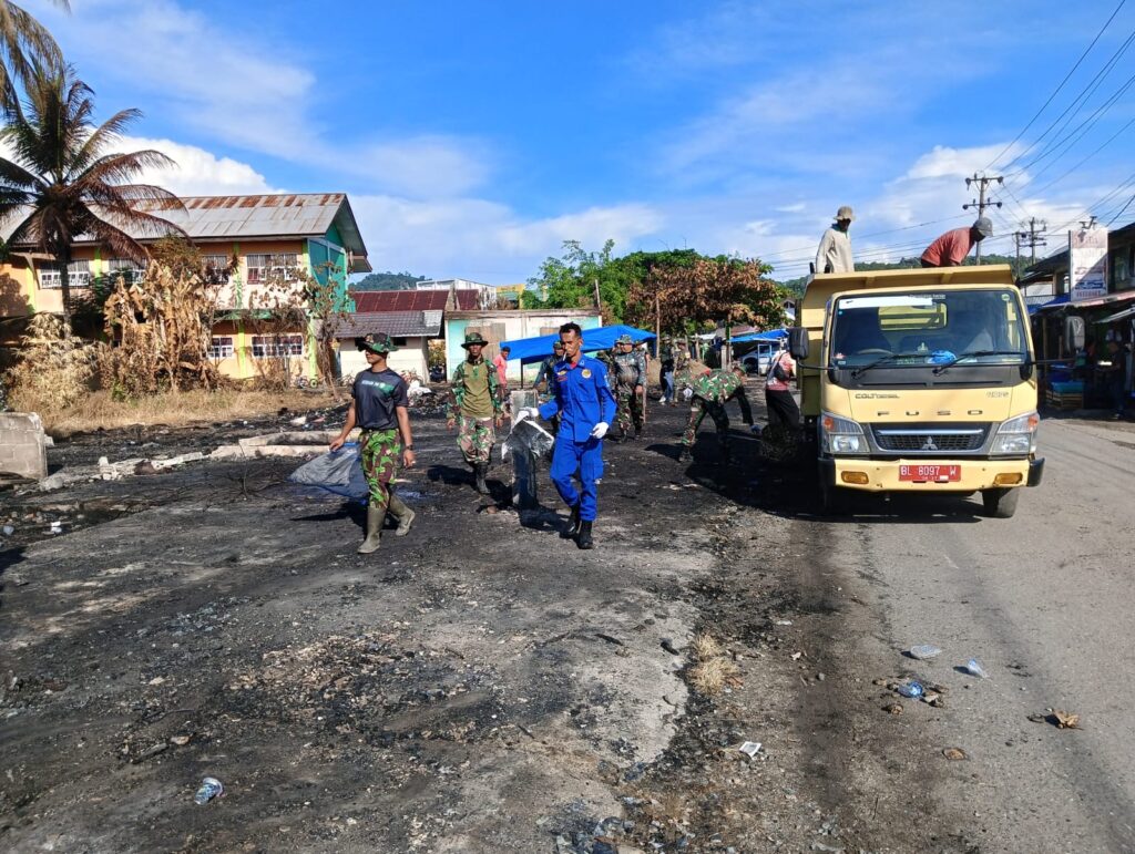 ACEH JAYA – Pesonil Kodim 0114 / AJ (Aceh Jaya) bersama sejumlah jajaran melaksanakan karya bakti pembersihan setelah musibah kebakaran yang menghanguskan 23 kedai tradisonal serta satu Ruang Perpusatakaan milik masyarakat Pasar Lamno Kecamatan Jaya Aceh Jaya, pada Rabu (30/2/2025).