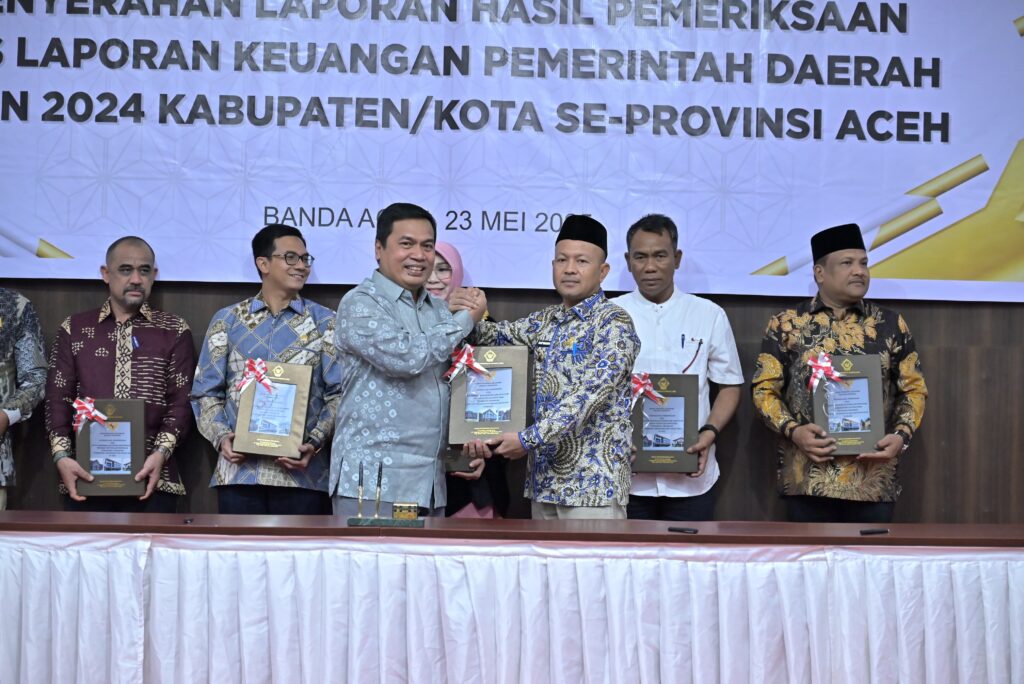 Bupati Aceh Jaya Safwandi, S. Sos didampingi Menyerahkan Laporan Hasil Pemeriksaan Atas Laporan Keuangan Pemerintah Kabupaten Aceh Jaya Tahun 2024 di Aula BPK RI Perwakilan Wilayah Aceh, Banda Aceh, Jum’at (23/5/2026).