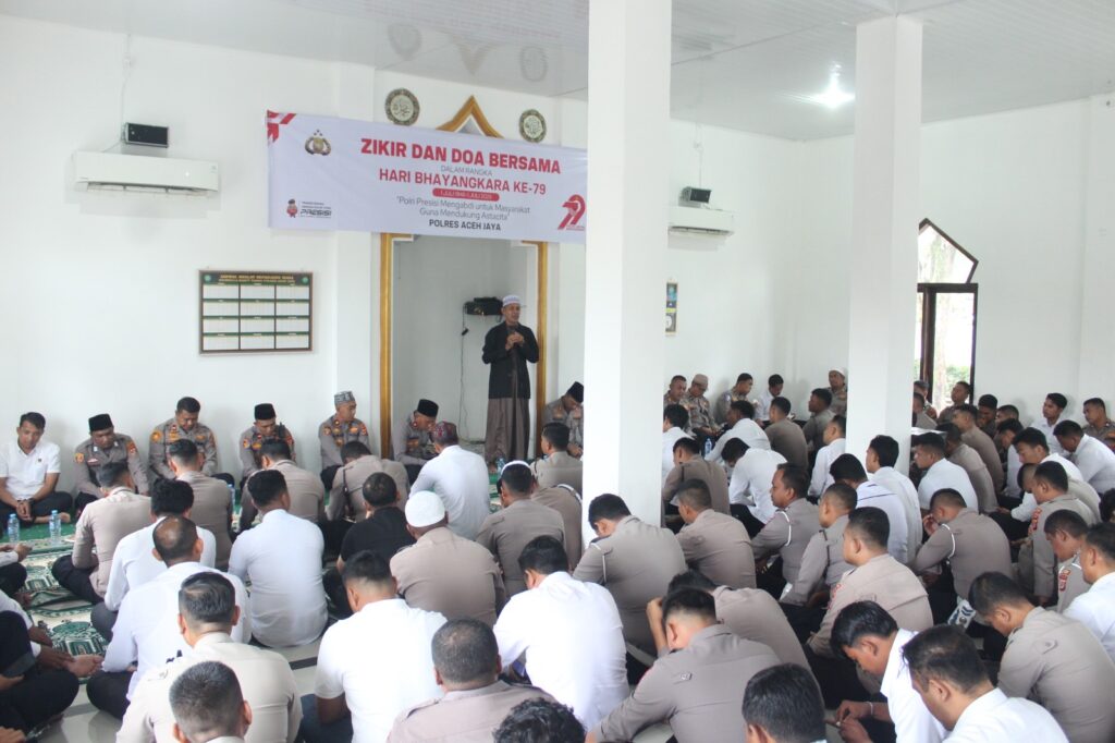 ACEH JAYA – Dalam rangka menyambut Hari Bhayangkara ke-79 Tahun 2025, Polres Aceh Jaya menggelar kegiatan Zikir dan Doa Bersama yang berlangsung khidmat di Mushola Babut Taqwa Polres Aceh Jaya, Sabtu (21/6/2025).