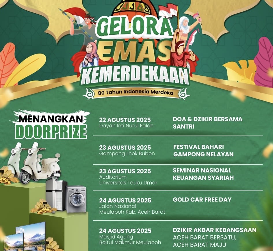 BANDA ACEH – Setelah menyambangi Kota Banda Aceh dan Lhokseumawe, Unit Usaha Syariah PT. Pegadaian akan menyapa warga Aceh Barat dengan ragam kegiatan bakti sosial dan pemberdayaan ekonomi masyarakat dalam semangat 80 Tahun Kemerdekaan RI, dengan tajuk “Gelora Emas Kemerdekaan”.