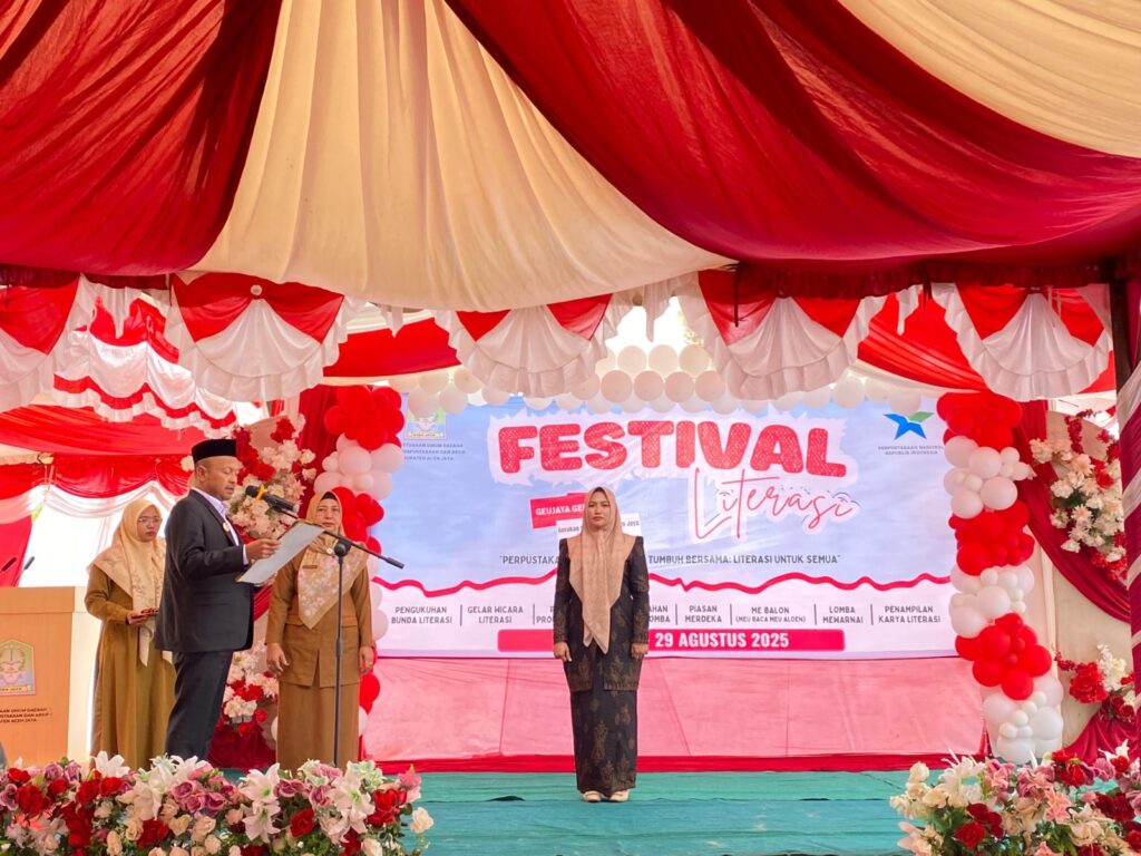 ACEH JAYA — Bupati Aceh Jaya, Safwandi, S.Sos., M.A.P membuka secara resmi Festival Literasi 2025 sekaligus mengukuhkan Ny. Desi Maulidar, S.E sebagai Bunda Literasi Kabupaten Aceh Jaya. Kegiatan berlangsung di halaman Kantor Dinas Perpustakaan dan Arsip (Disarpus) Aceh Jaya pada Senin (25/8/2025).