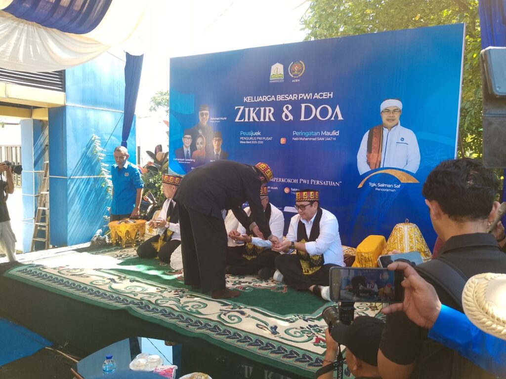 Acara prosesi adat “Peusijuek” tersebut berlangsung di Kantor PWI Aceh yang dibarengi dengan agenda merayakan Maulid Nabi Besar Muhammad SAW di jalan T. Angkasah No 3 Kota Alam, Simpang 5 Banda Aceh Sabtu (1/11/2025).