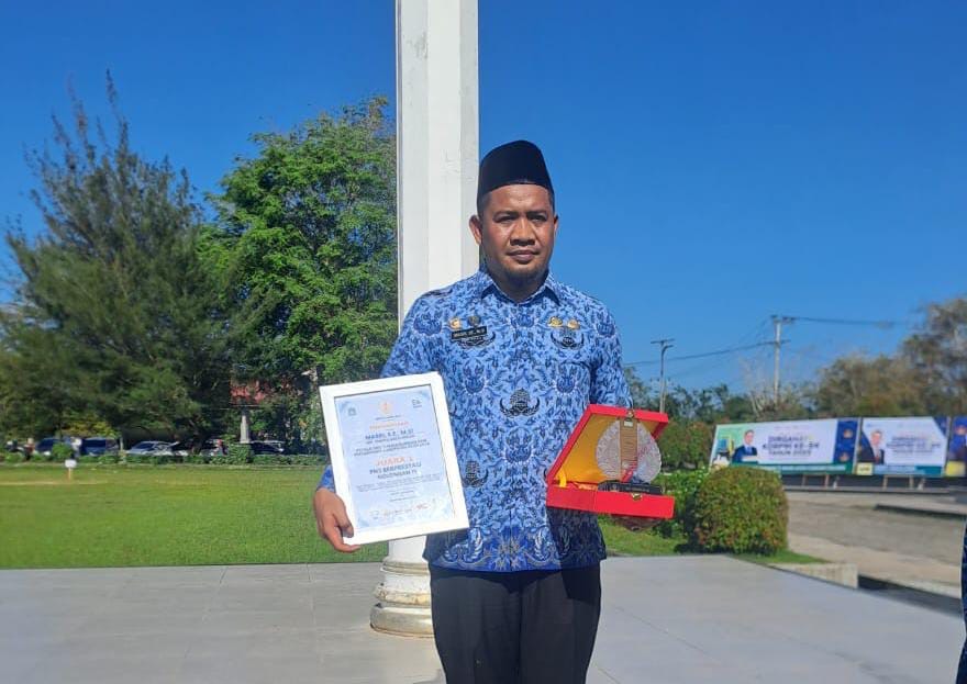 ACEH JAYA – Kepala Dinas Perhubungan dan Pertanahan Kabupaten Aceh Jaya, H. Masri menerima penghargaan ASN Terbaik Golongan IV dari Bupati Safwandi dalam prosesi pelaksanaan upacara peringatan Hari Ulang Tahun (HUT) ke -54 Korps Pegawai Republik Indonesia (Korpri) di halaman Kantor Bupati Aceh Jaya, Senin (01/12/2025).
