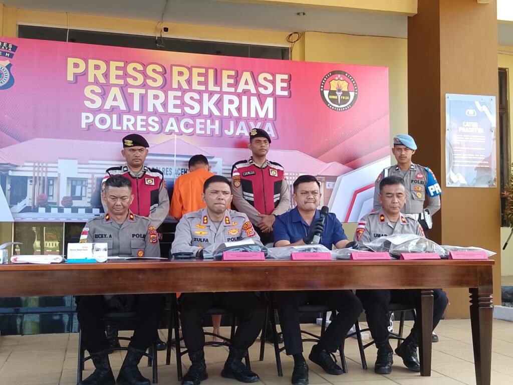 “MA berhasil kita tangkap di Siak Riau,” kata Kapolres Aceh Jaya, AKBP. Zulfa Renaldo di dampingi Waka Polres, Kompol. Ricky Andrika, Kasat Reskrim Iptu. Julian Zahri dan Kabag Ops Kompol. Nyak Umar dalam Konferensi pers di halaman Polres setempat, Rabu (7/1/2026)