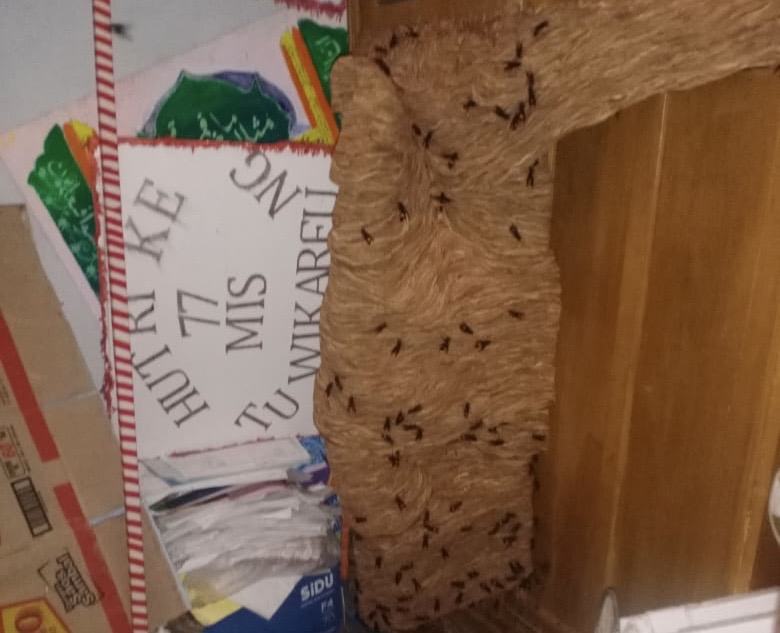 Setibanya di lokasi, tim segera melakukan asesmen dan pengamanan area. Selanjutnya, petugas melaksanakan evakuasi sarang tawon vespa yang berada di dalam kantor Dewan Guru dengan menggunakan alat pelindung diri (APD) serta peralatan pendukung lainnya.